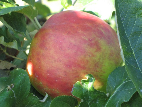 Aussehen:Die Bäume haben sehr weit ausladende Kronen, sie sind robust und wenig schorfempfindlich. Die Früchte sind von gelblicher Farbe, sonnenseits rötlich marmoriert, mit grünen Punkten übersät und rund.
