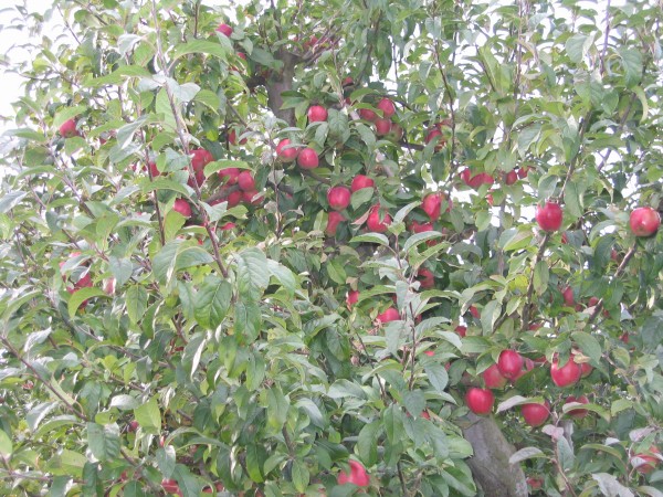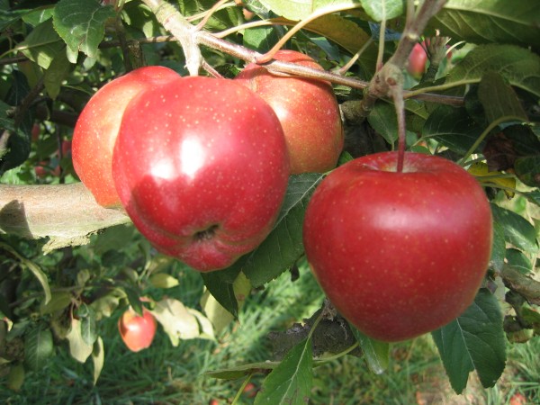 Aussehen: Die Bäume haben eine aufrechte enge Krone mit sehr starkem Wuchs. Die Früchte sind mittel bis groß, glockenförmig kantig mit roter Deckfarbe und relativ stark beduftet.
